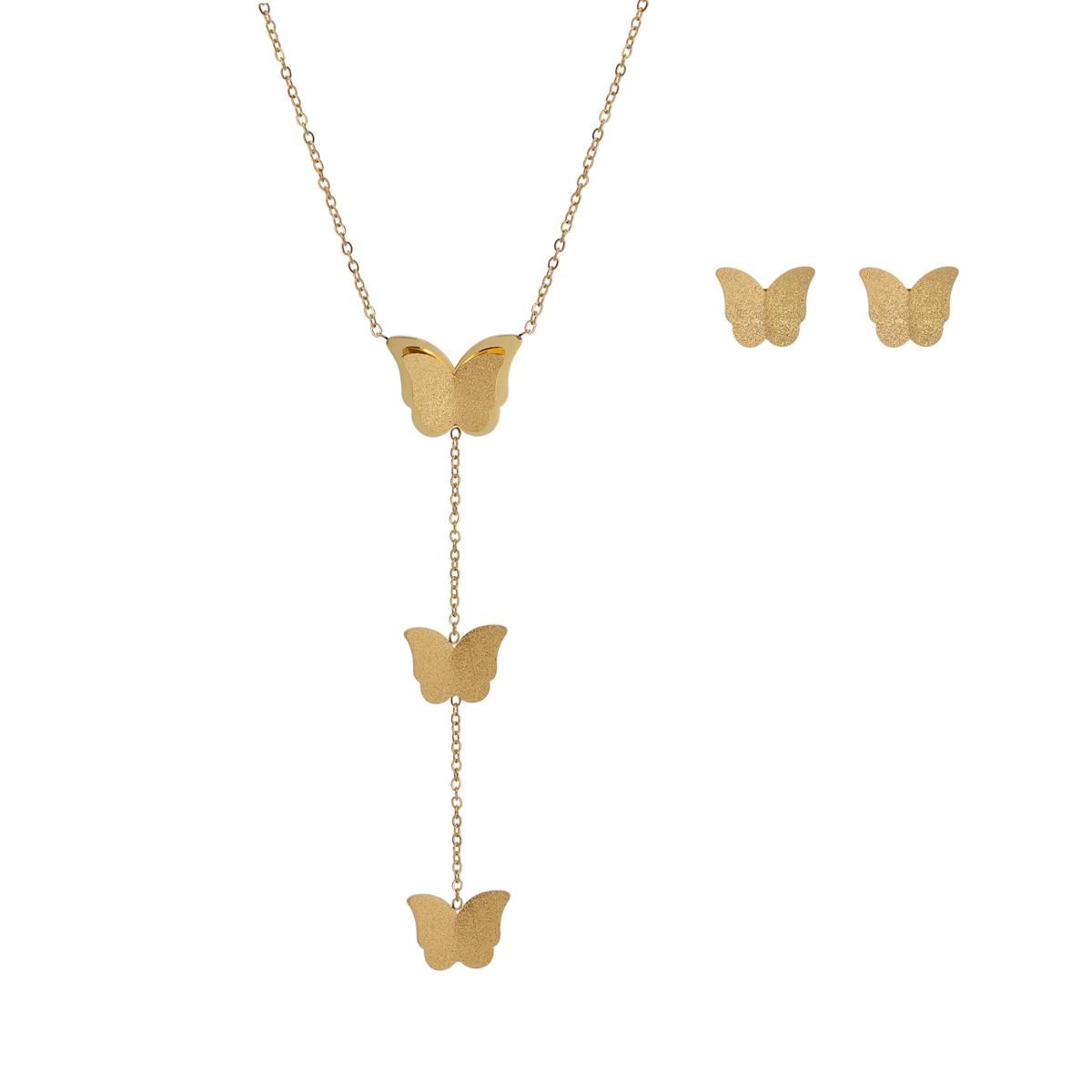 Stately Steel Butterfly Lariat Necklace and Stud Earring Set