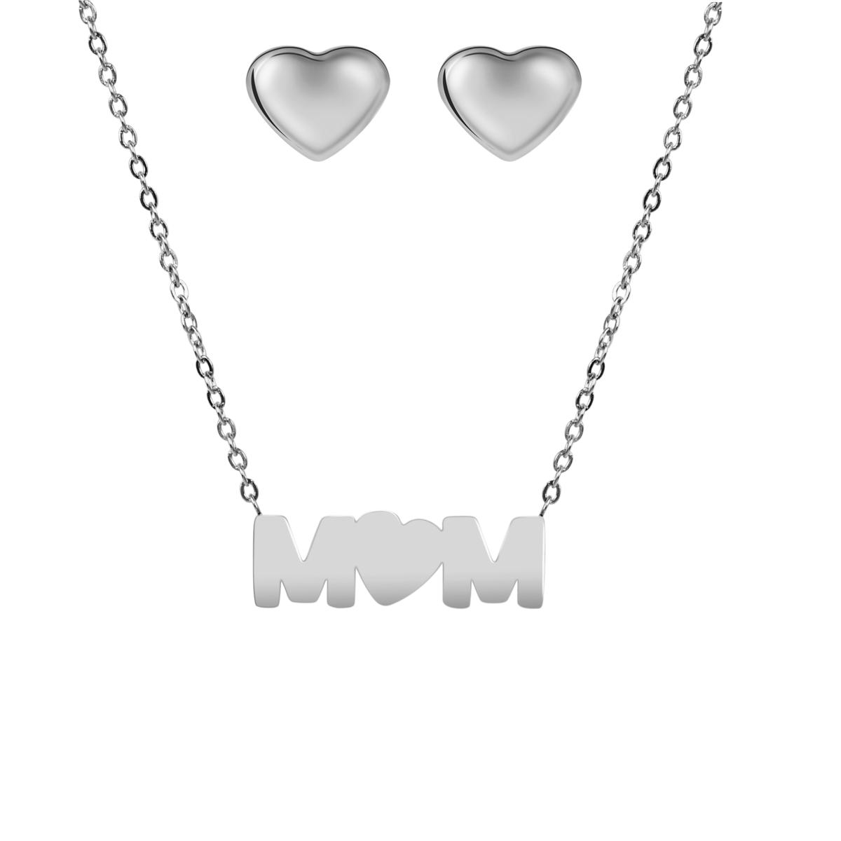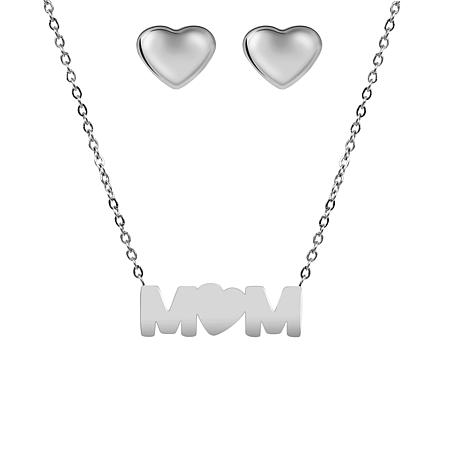 Show mom how much you care with this heart-themed "Mom" necklace and earring set. Made of durable stainless steel.