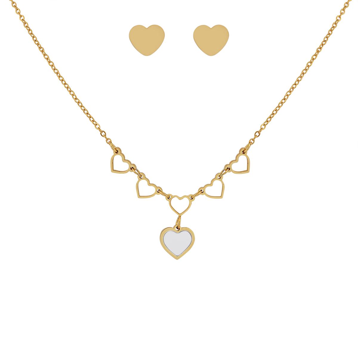 A stainless steel necklace brimming with hearts, paired with heart-shaped stud earrings, are a fun, fashionable way to dress up most any outfit. Choice of colors.