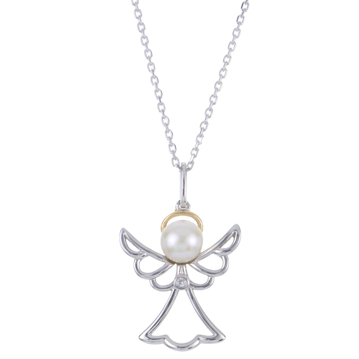 Sterling Silver and 10K Cultured Pearl and Diamond Angel Necklace