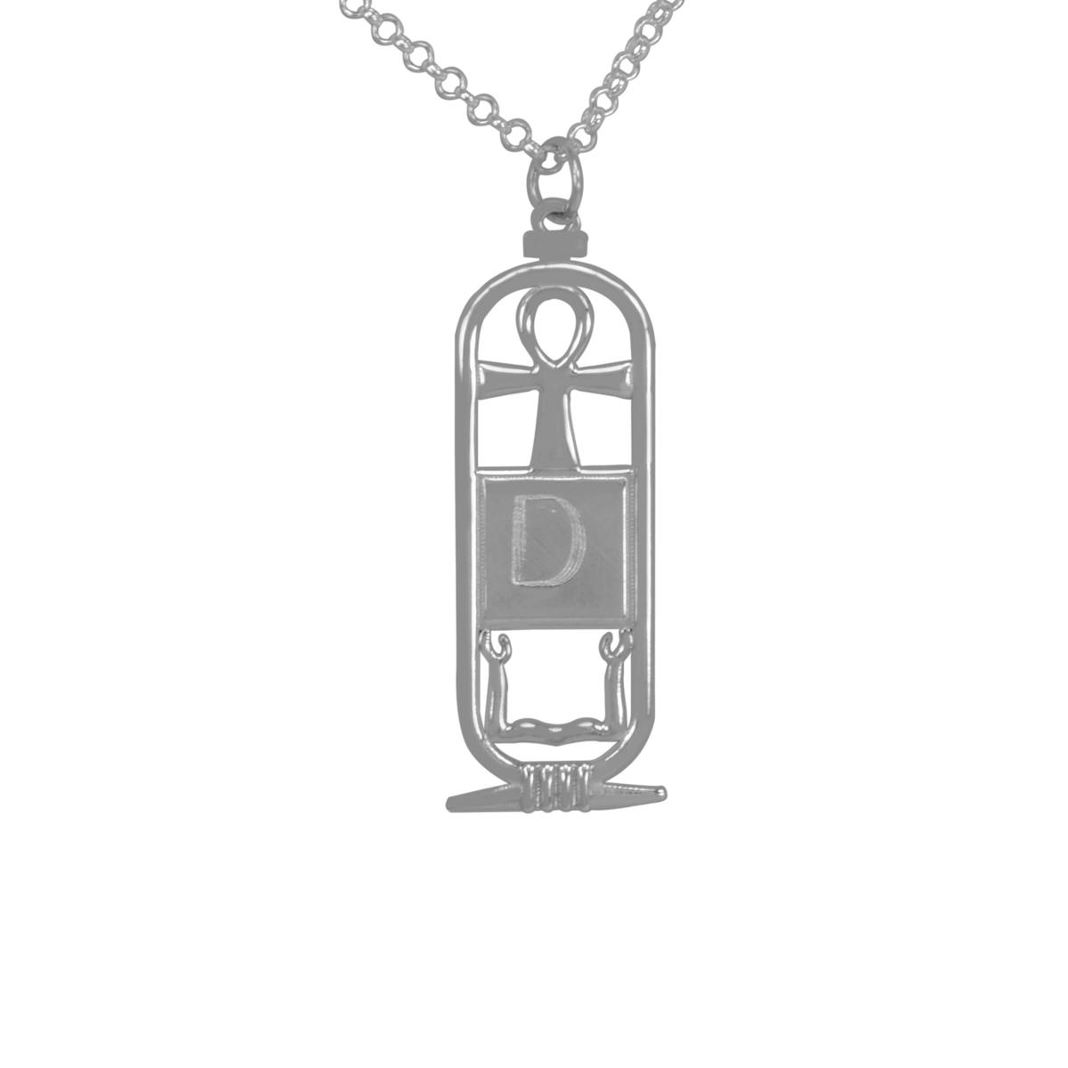 Give a unique spiritual gift to someone special with this personalized cartouche necklace. The top symbol in the cartouche is the "Ankh," known as the "Key of Life." The lower symbol is "Ka," representing the soul and spirits. Your chosen initial will be the middle symbol in English characters.