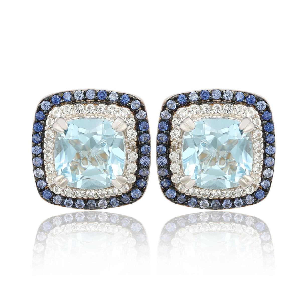 - Stud-style earrings have cushion-cut colored gemstone solitaires prong-set in center, framed in one row of round, white topaz, and second row of round, colored sapphires