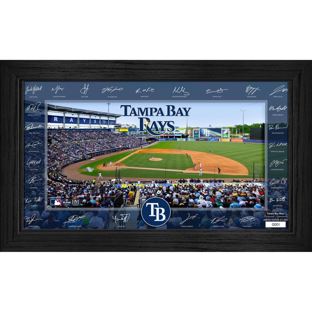 The Tampa Bay Rays Signature Field features the facsimile (exact replica) signatures of most players on the 2025 team roster around their home field. A limited edition of only 5000, each print is individually hand numbered and delivered in a 12” x 20” wooden frame with a plexi-glass front panel. Officially licensed by MLB and MLBPA, each frame is accompanied by the appropriate hologram and proudly made in the USA by The Highland Mint. Note that players and field images may be updated periodically throughout the season.