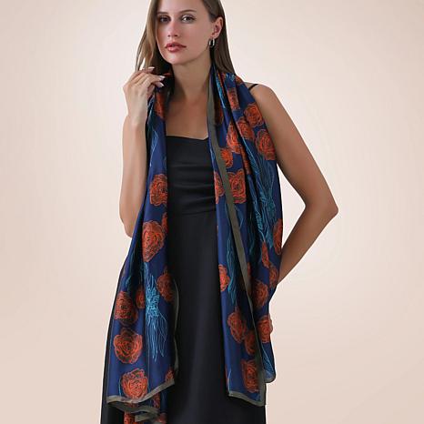 Rich royal blue background and modern orange roses make this scarf a true standout in every wardrobe. Looks great with dresses, pantsuits or under a coat. The soft, silky feel will make this scarf one of your favorites.