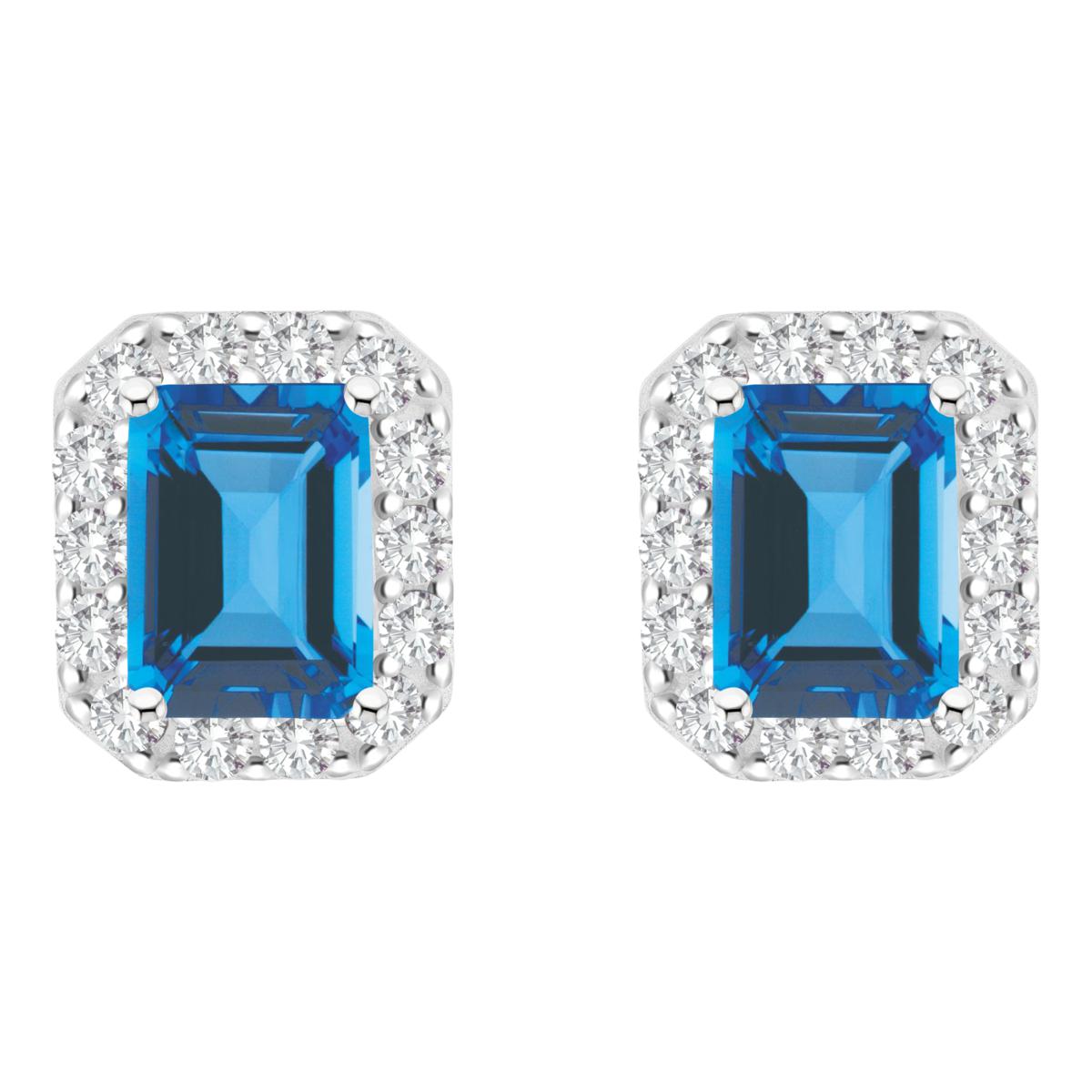 A classic dazzler, this sterling silver stud shows off a bright, emerald-cut gemstone that twinkles inside a halo of white topazes.
