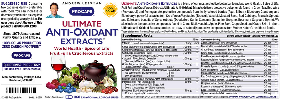 Ultimate Anti-Oxidant Extracts delivers polyphenols found in Green Tea, Red Wine (Resveratrol) and Pomegranate, compounds from richly-colored berries (Açai, Bilberry, Blueberry, Cranberry and Elderberry), powerful extracts from Cruciferous Vegetables (Broccoli, Wasabi, Mustard Seed, Red Cabbage, Brussels Sprouts and Kale), and benefits of Spice extracts (Deodorized Garlic, Curcumin (Turmeric), Oregano, Rosemary, Sage and Thyme).