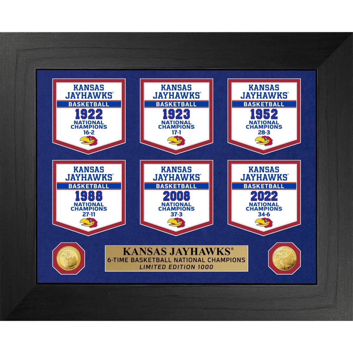 Celebrate the University of Kansas Jayhawks' six Basketball National Titles with this stunning deluxe wood frame. Featuring double matted banners under acrylic glass, it includes two minted gold-plated coins and an engraved nameplate for a truly special display. Perfect for fans looking to showcase their team pride with a collectible that's officially licensed and proudly made in the USA.