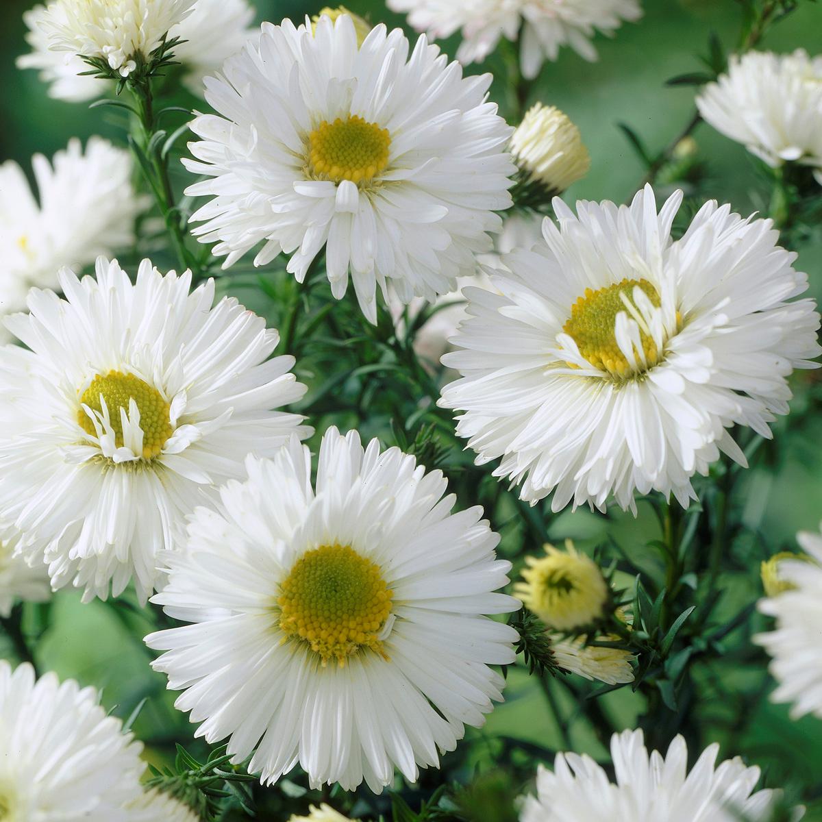 Aster is a deciduous perennial which produces daisy like flowers atop dark green leaves. They are a mainstay in the fall garden and very easy to grow. Use in borders, cottage gardens, along walkways or paths and/or in sunny locations in containers Aster White Ladies is known for its mass of white double flowers, which reveal a yellow center later in the season.