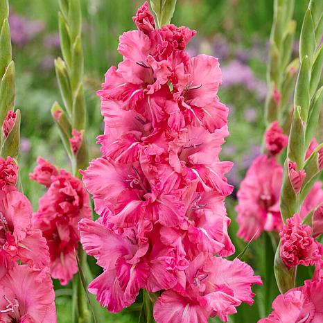 Today's Gladiolus (or simply 'glads' as they are quite often called) are more beautiful than varieties of years ago and produce lush sword like foliage. They appreciate the warm weather of summer and are very easy to plant and grow. Gladiolus come in a wide selection of classic colors as well as the newest bi-colors or tricolors. After the danger of frost has passed, you can plant them all at once, or plant them bi-weekly for continuous flowers throughout summer. They are best planted in groups and make for excellent lavish florist quality cut flowers. Kingston Ruffle gladiolus features curvy and graceful flowers in warm pink tones. They are true wildlife magnets and add a touch of elegance and romance to any garden with its flowers.