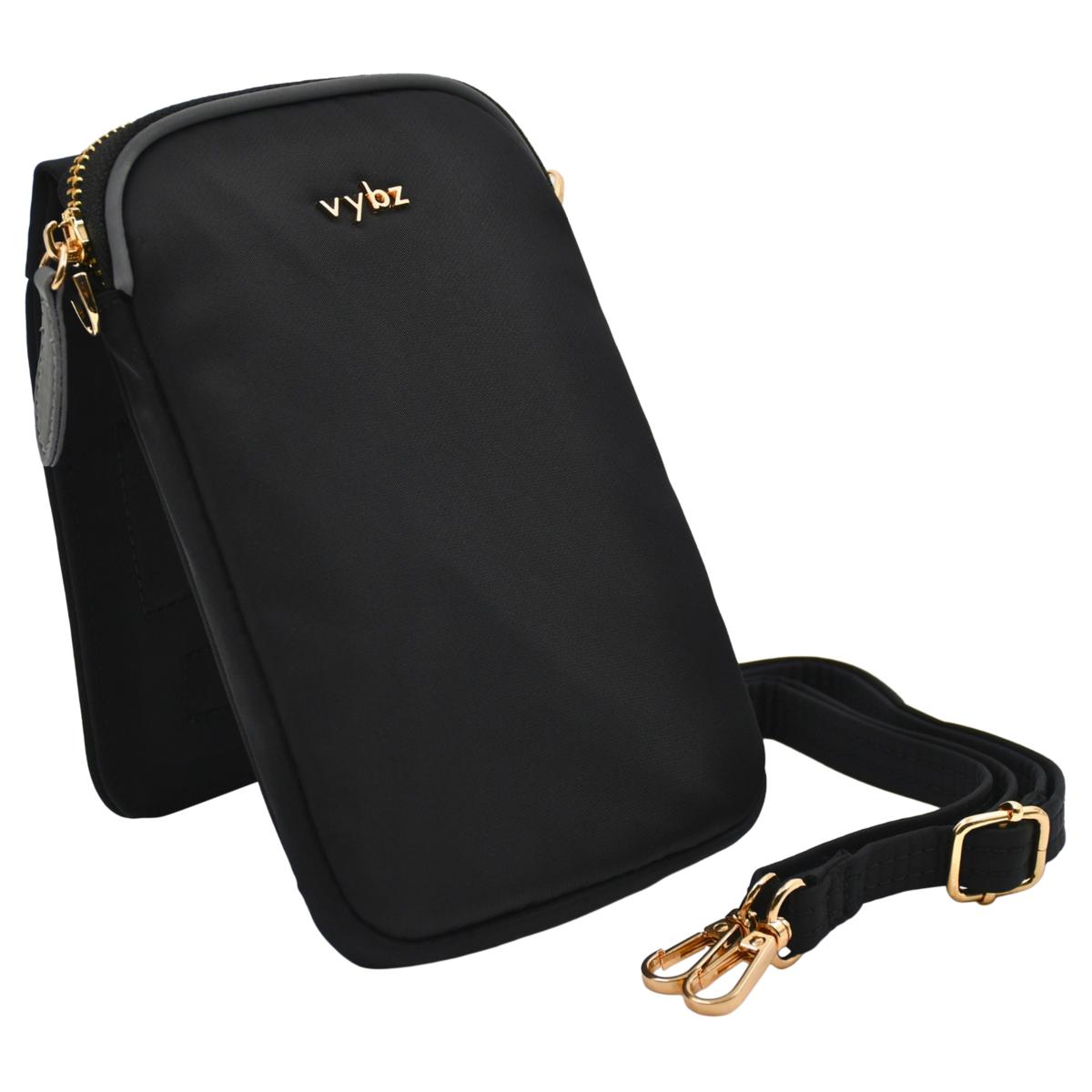 Secure your VYBZ Pocket Pal effortlessly with powerful magnetic closures that keep your essentials in place, so you can focus on your day. Fabulously functional, this magnetic phone pouch features "Snap-Lock" technology, incorporating petite but powerful magnetics to connect to your hip without a bulky belt or strap. Includes a removeable color-matched crossbody strap, giving you more options for wearing. With RFID shielding technology for extra security.