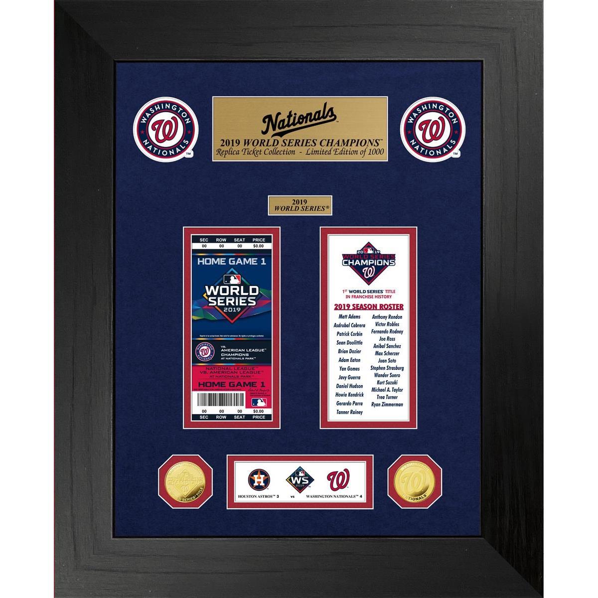 Featured in a black wood frame with molding and double matting is the Washington Nationals commemorative World Series ticket collection! This collectible frame is highlighted with a gold plate Nationals 1-time World Series Champions commemorative coin and a gold plate team coin. Also matted in the frame are engraved nameplates and die cut team logos.