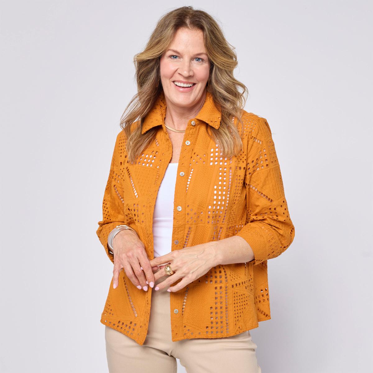 This breezy 3/4 sleeve shirt features a charming pointelle patchwork design that adds texture and style to your everyday look. Perfect for layering or wearing solo, it pairs effortlessly with your favorite jeans or skirts. The button-front closure and pleated cuffs bring a polished touch to casual comfort.