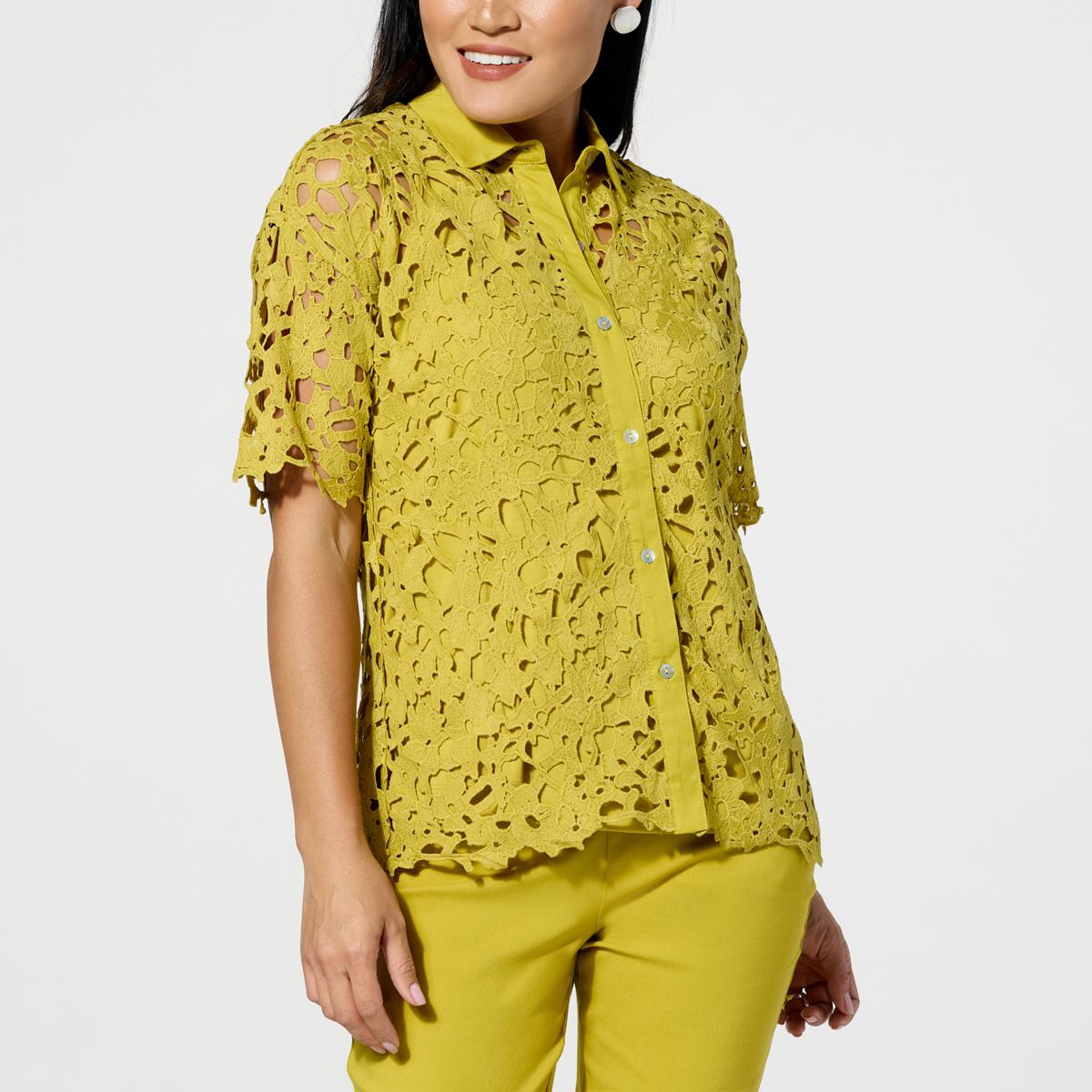 Top off any outfit with fresh spring vibes. Paired with skinny jeans, a cami and your favorite jewelry, this short-sleeve, button-down woven crochet lace shirt completes your look.