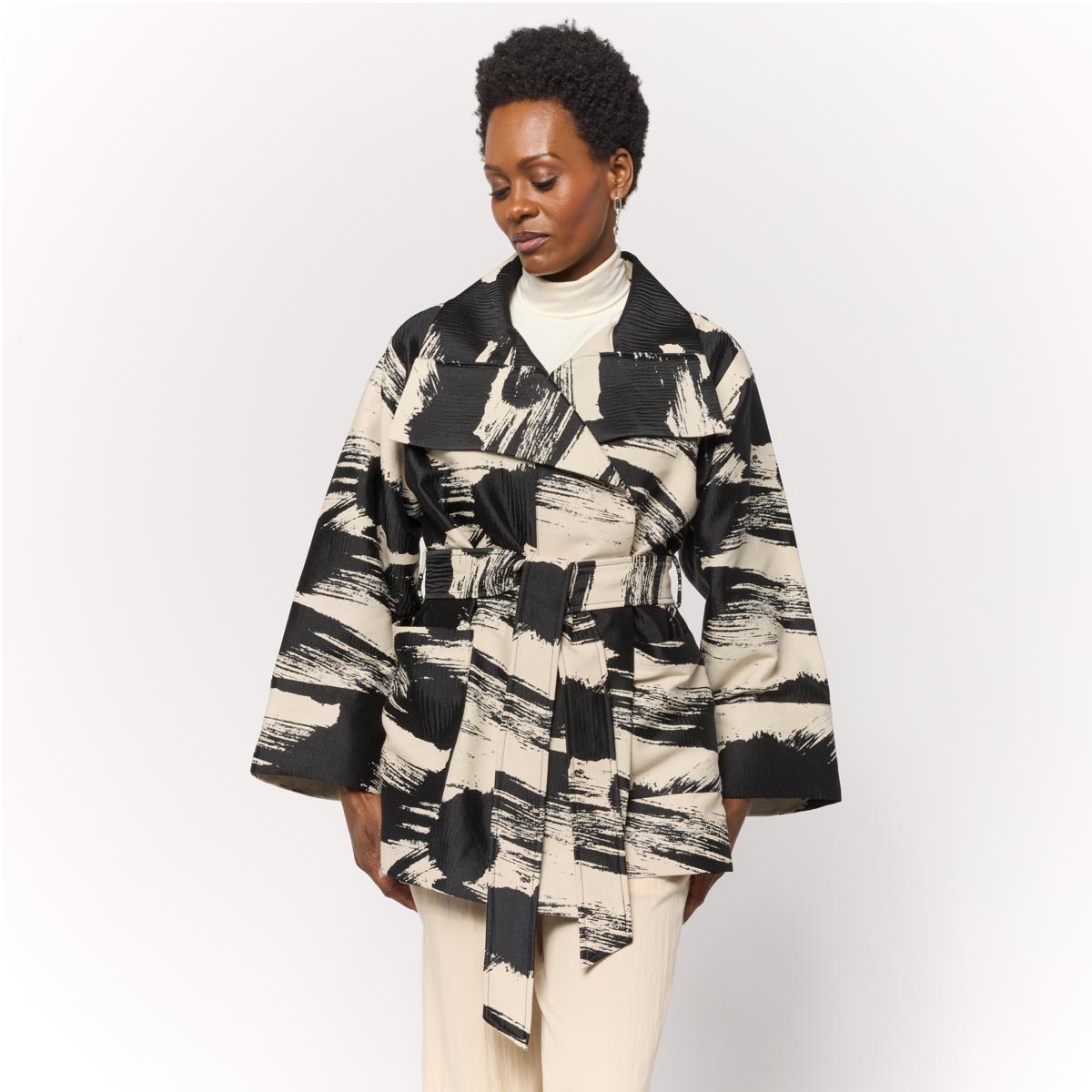 Make a statement with this artful jacket featuring a bold brushstroke jacquard print and a flattering kabuki silhouette. The self belt at the waist lets you customize your fit, while the patch pockets add practical style. Perfect for layering over your favorite outfits to elevate your look with ease and flair.