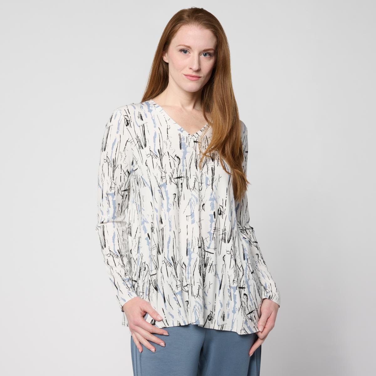 This long sleeve V-neck top blends printed and solid rayon span fabric for a versatile look. The forward side seam adds a flattering silhouette, perfect for layering or wearing solo. Dress it up or down for effortless style all season long.