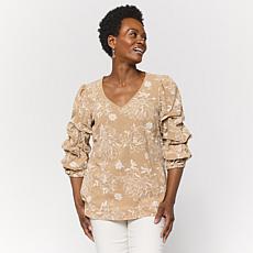 "As Is" Nina Leonard V-Neck 3/4 Pick-Up Sleeve Printed Top
