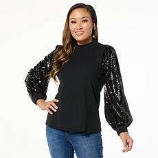 "As Is" DG2 by Diane Gilman Sequin Sleeve Mock-Neck Top