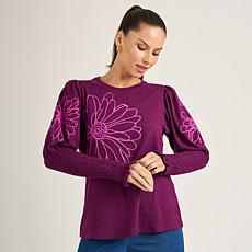 "As Is" DG2 by Diane Gilman Embroidered Balloon-Sleeve Brushed Knit...